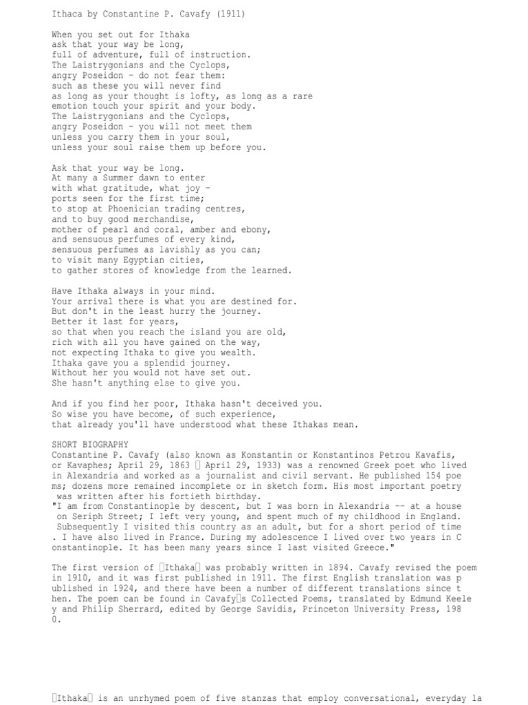 Ithaca is based on Homers account of Odysseuss journey home. Here are some preliminary steps in writing a summary. Cavafys poem Ithaca written In 1911 is one of his most highly regarded works.