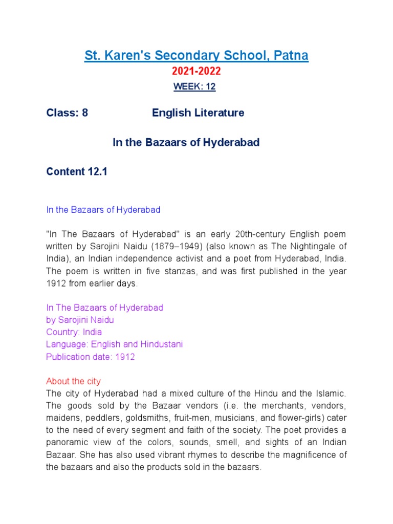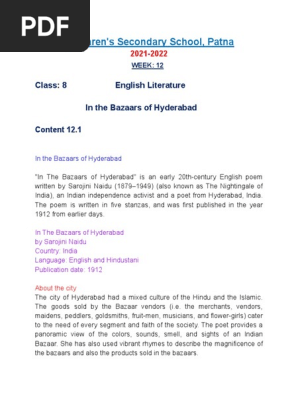 In the Bazaars of Hyderabad by Sarojini Naidu Summary and Analysis. Read and download free pdf of CBSE Class 8 English In The Bazaars Of Hyderabad Worksheet. Please send me extra questions on the poem In the Bazaars of Hyderabad by.